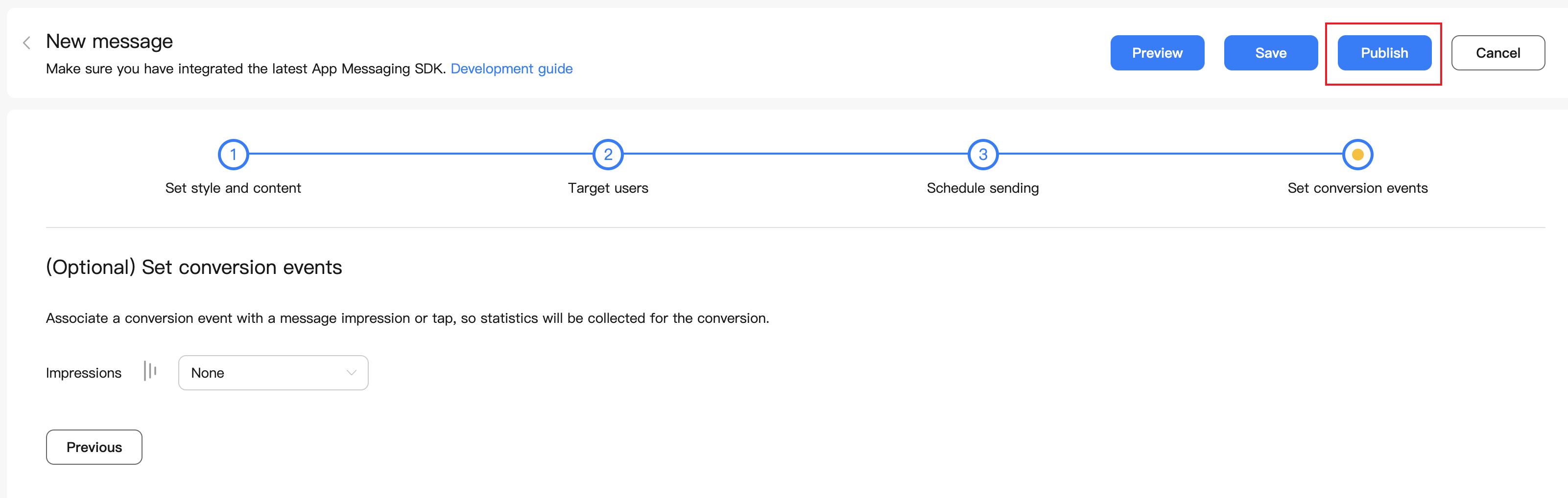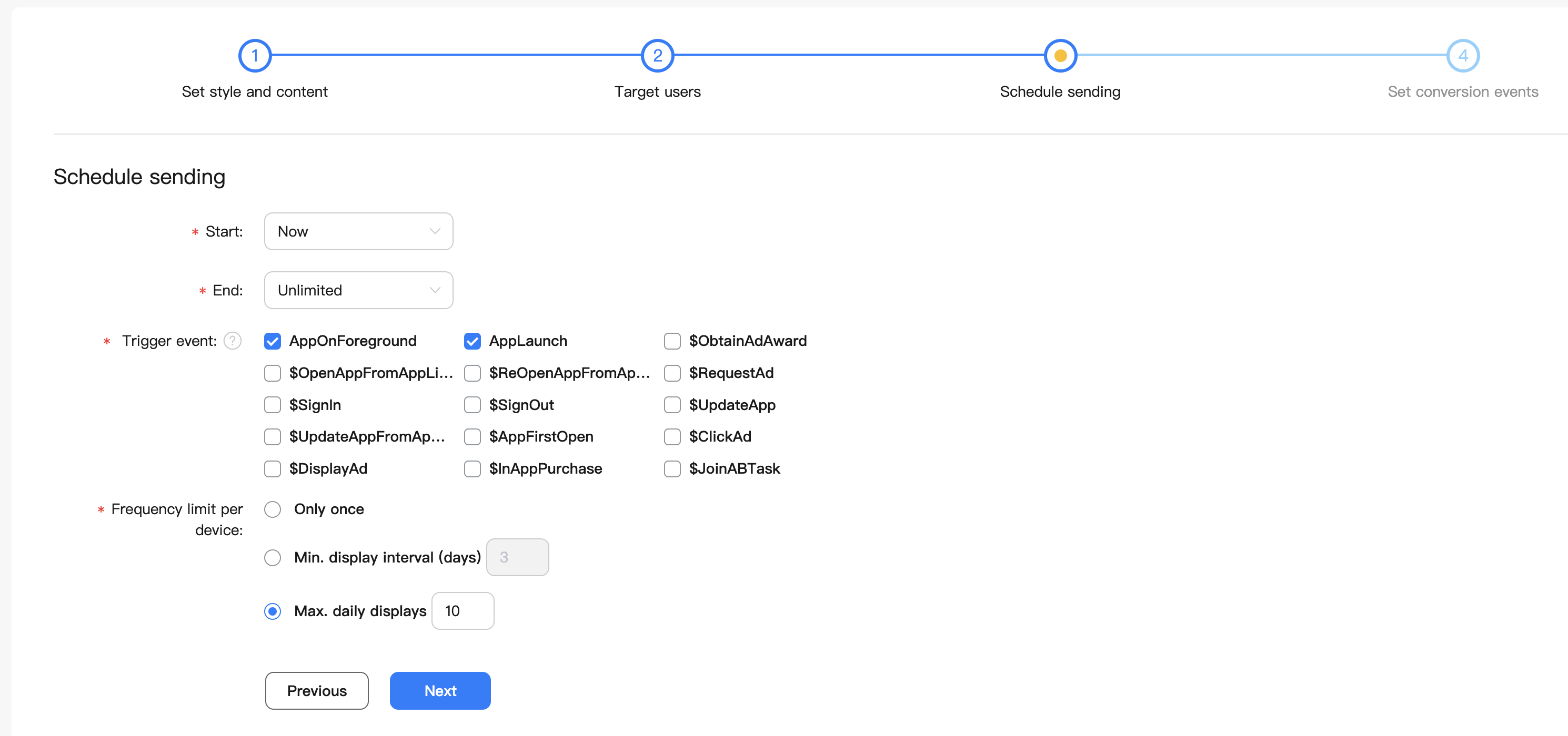 - Set the sending time as follows. The settings mean that the message will be displayed when your app runs in the foreground or is launched.