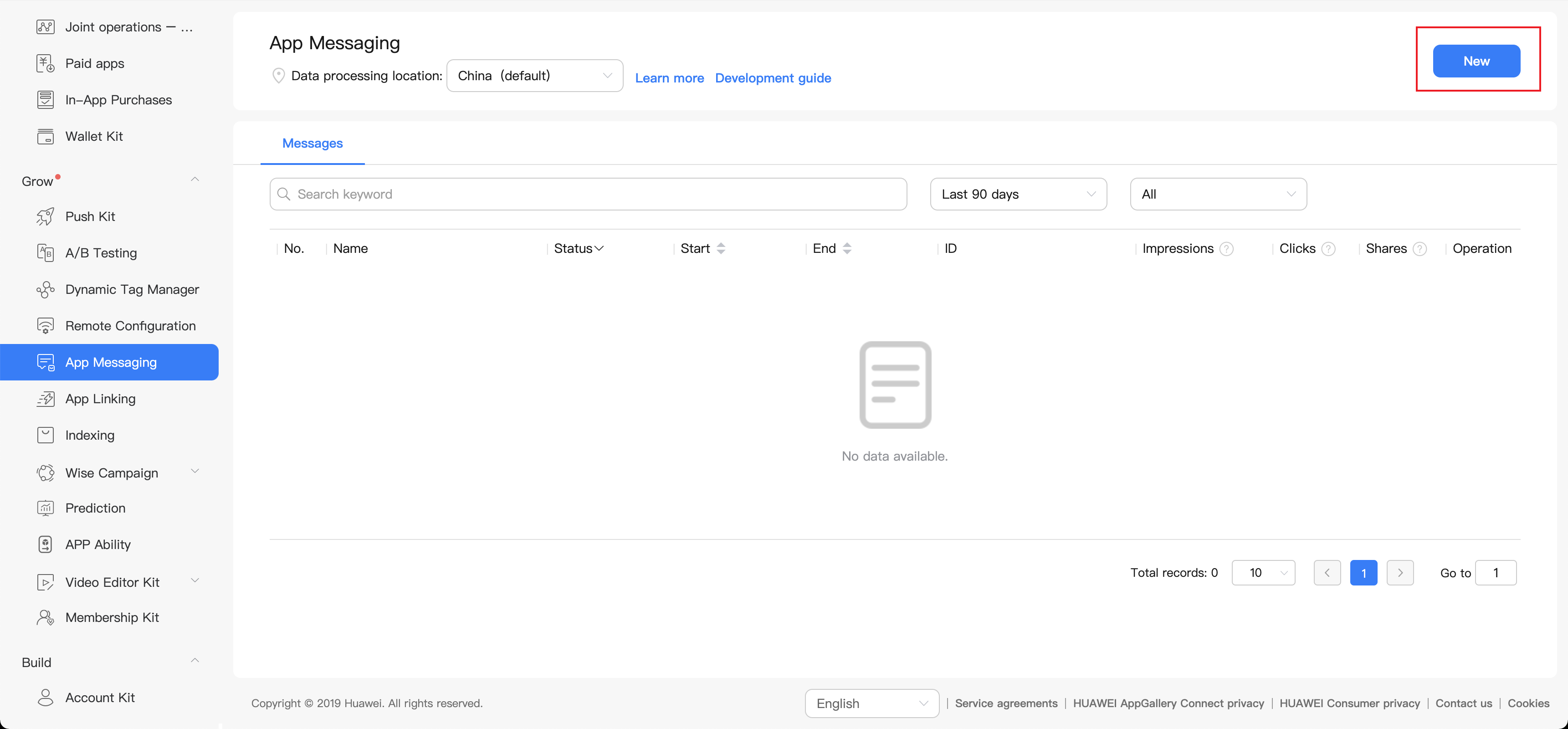 - Go to Grow > App Messaging. On the displayed page, click New.