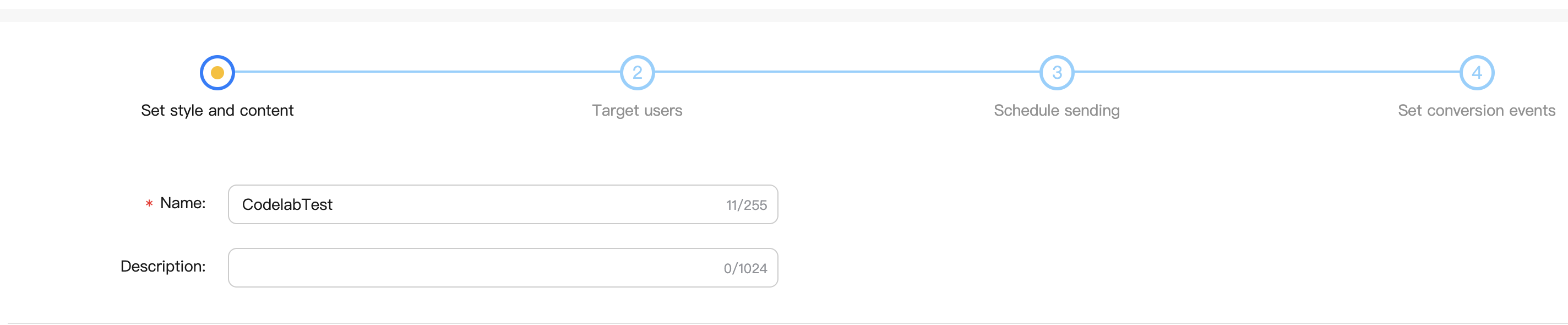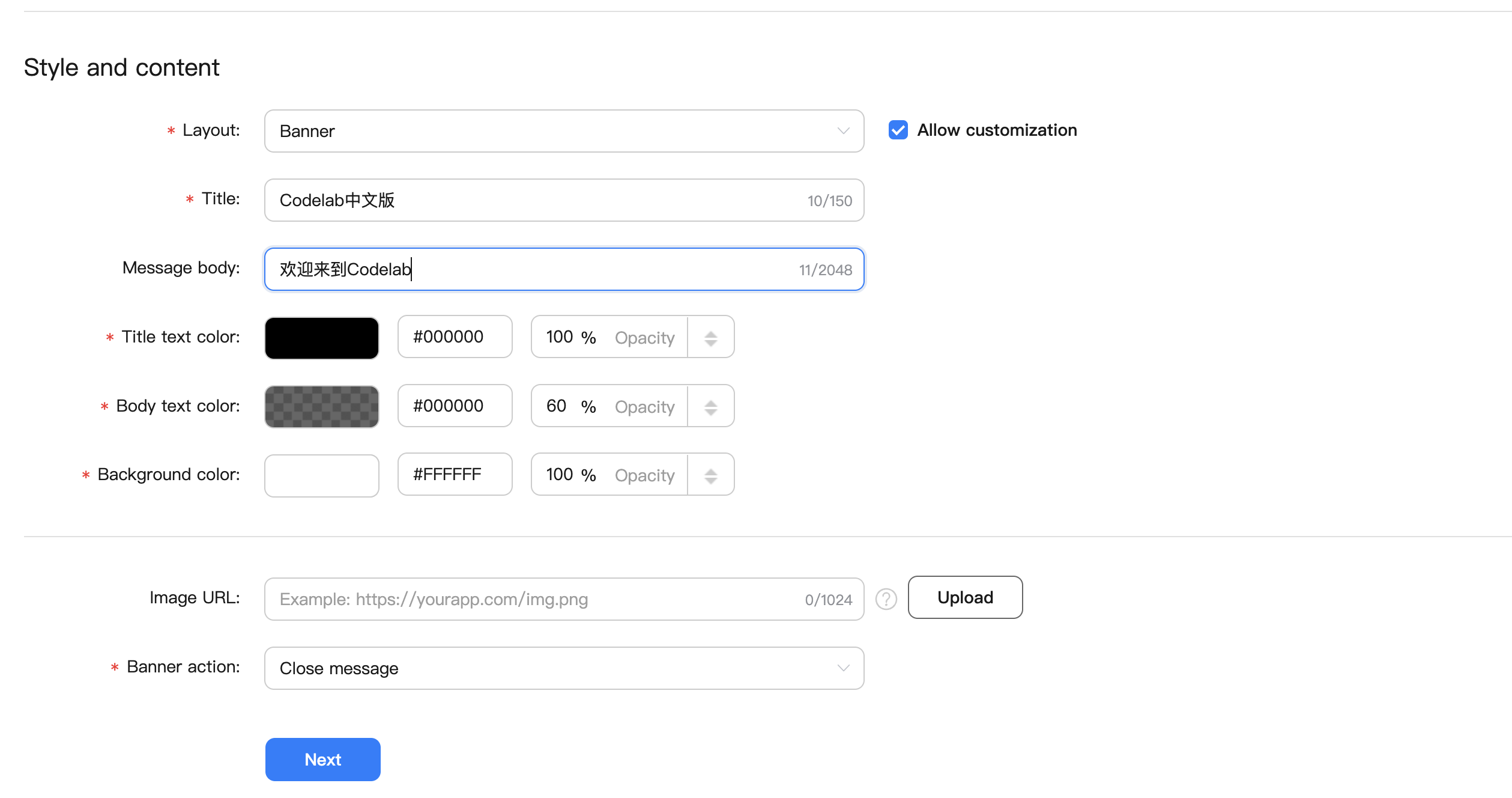 - Set the style and content. In this codelab, create a banner message. Set the message title and body in English. Set other information as required, and click Next.