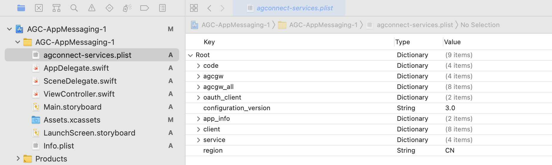 Import AGConnectCore and AGConnectAppMessaging to the AppDelegate class of the app, and call AGCInstance.startUp in the didFinishLaunchingWithOptions method for initialization.