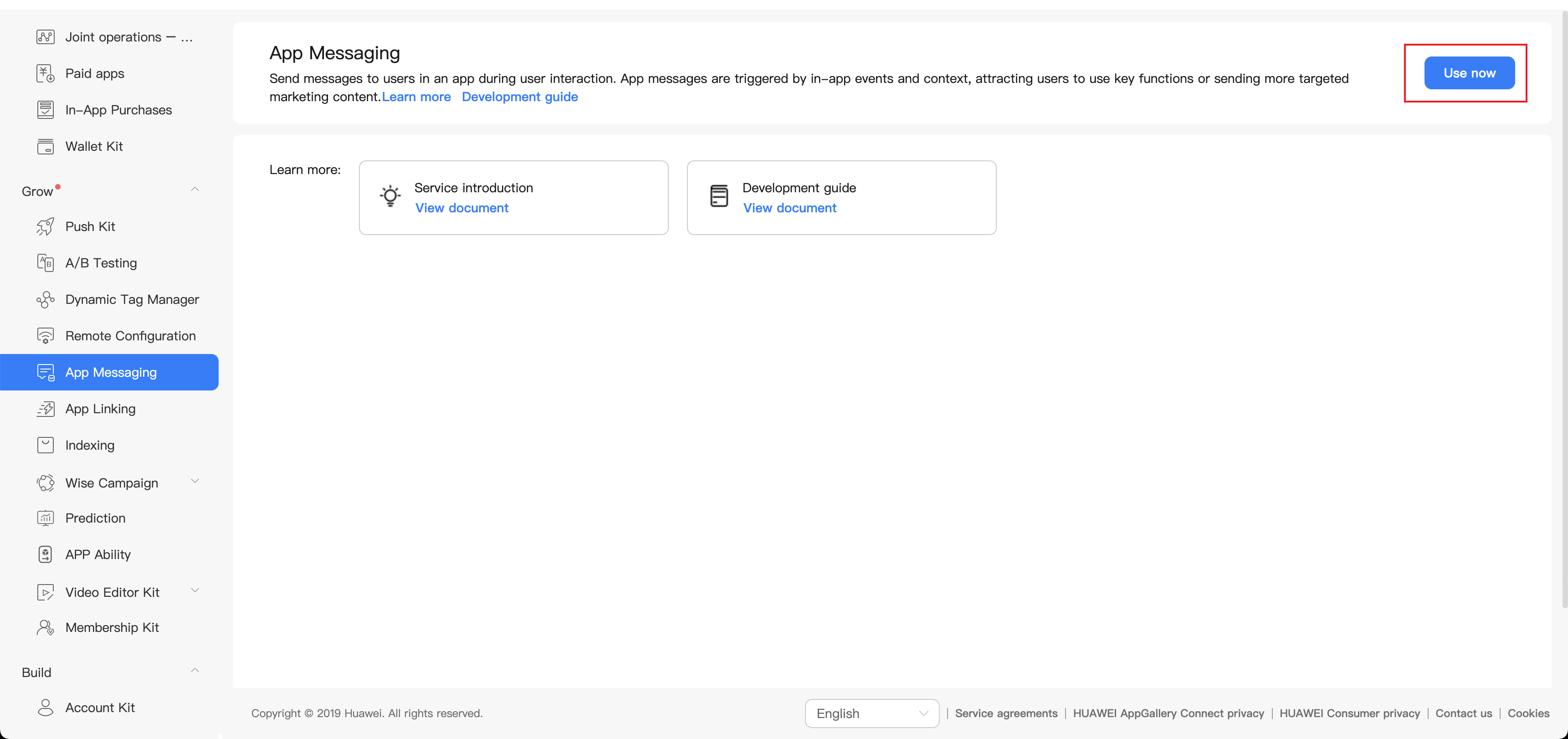 - Go to Grow > App Messaging. If this is your first time using App Messaging, click Use now.