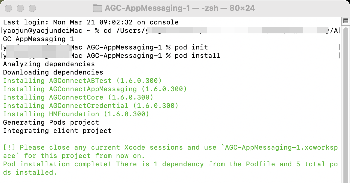 - Edit the Podfile to add the pod ‘AGConnectAppMessaging' dependency.