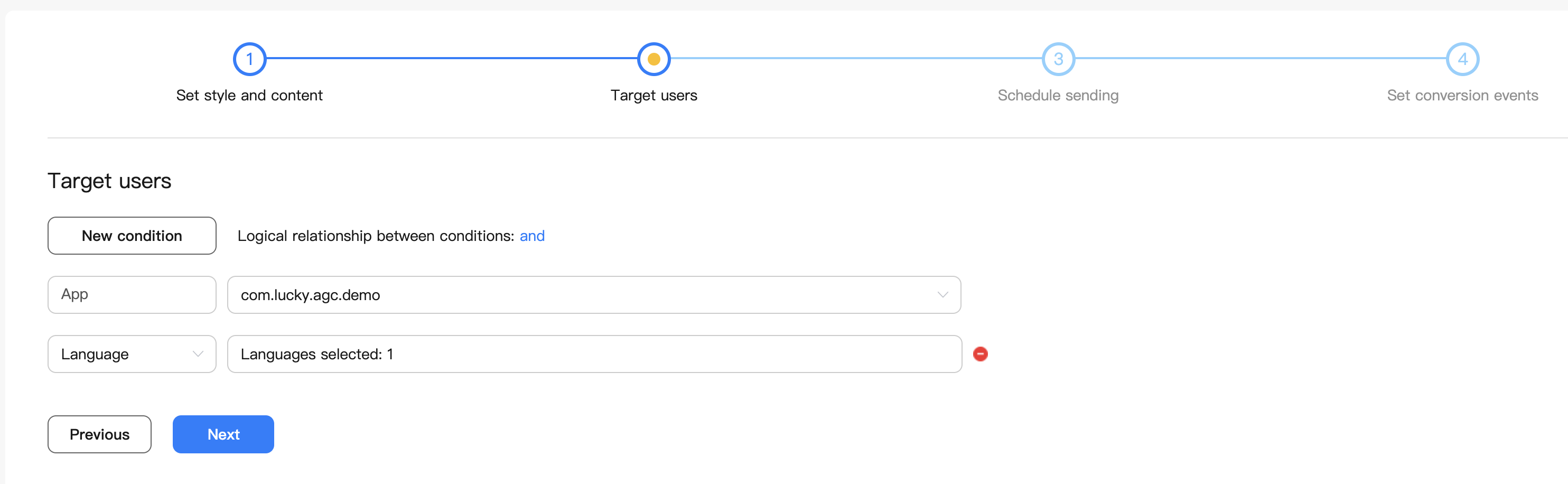 - Specify target users, set the default condition as sending messages by app, and select the package name of the current app. In this codelab, messages in different languages are needed, so you can click New condition to select Language as another condition.