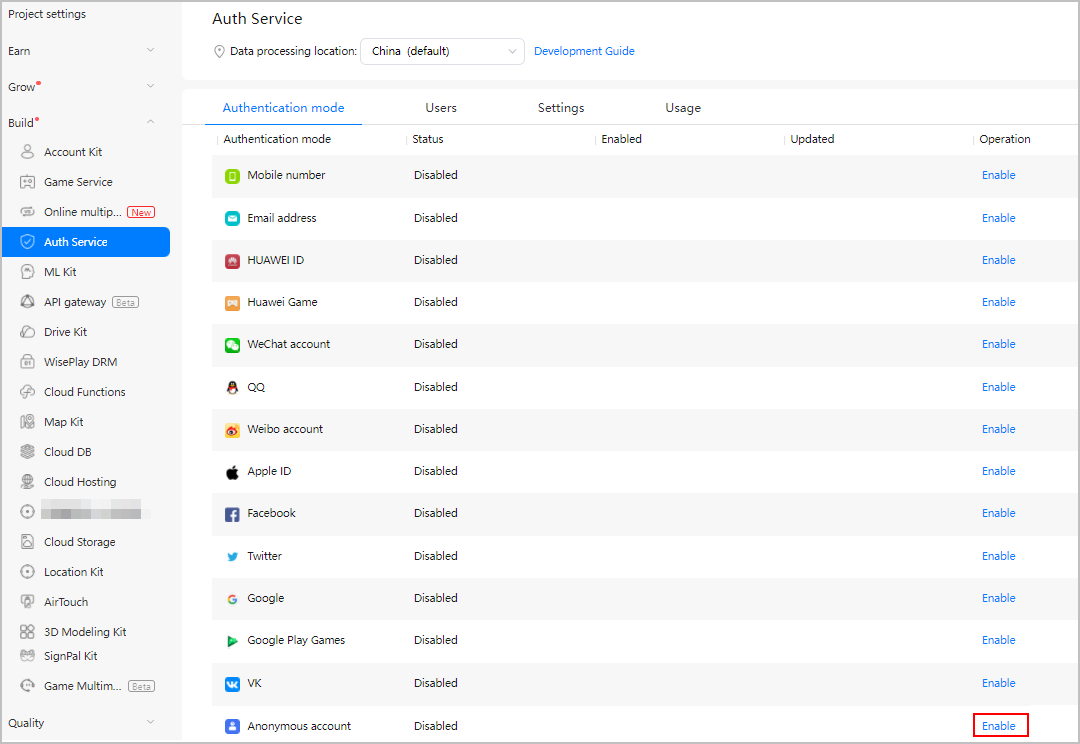 The sample code in this codelab uses the anonymous sign-in mode. Therefore, you need to enable anonymous authentication of Auth Service in AppGallery Connect. Otherwise, sign-in fails.