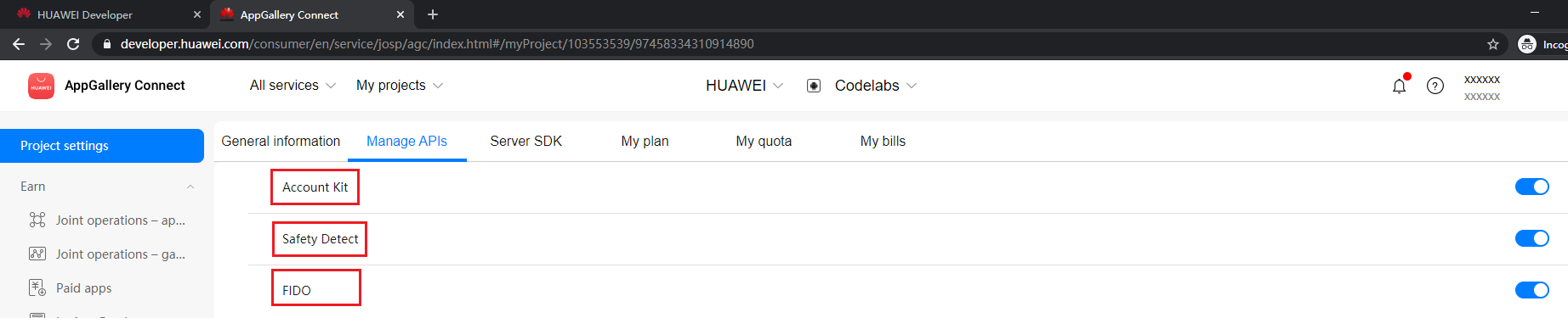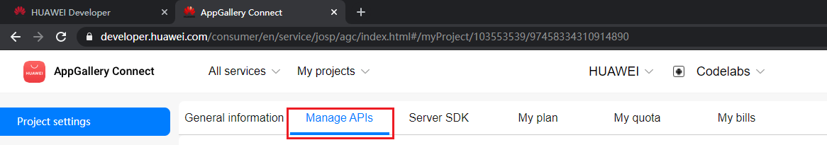 Sign in to AppGallery Connect and click My projects. In the project list, select the created app. Then in Project settings, click Manage APIs.