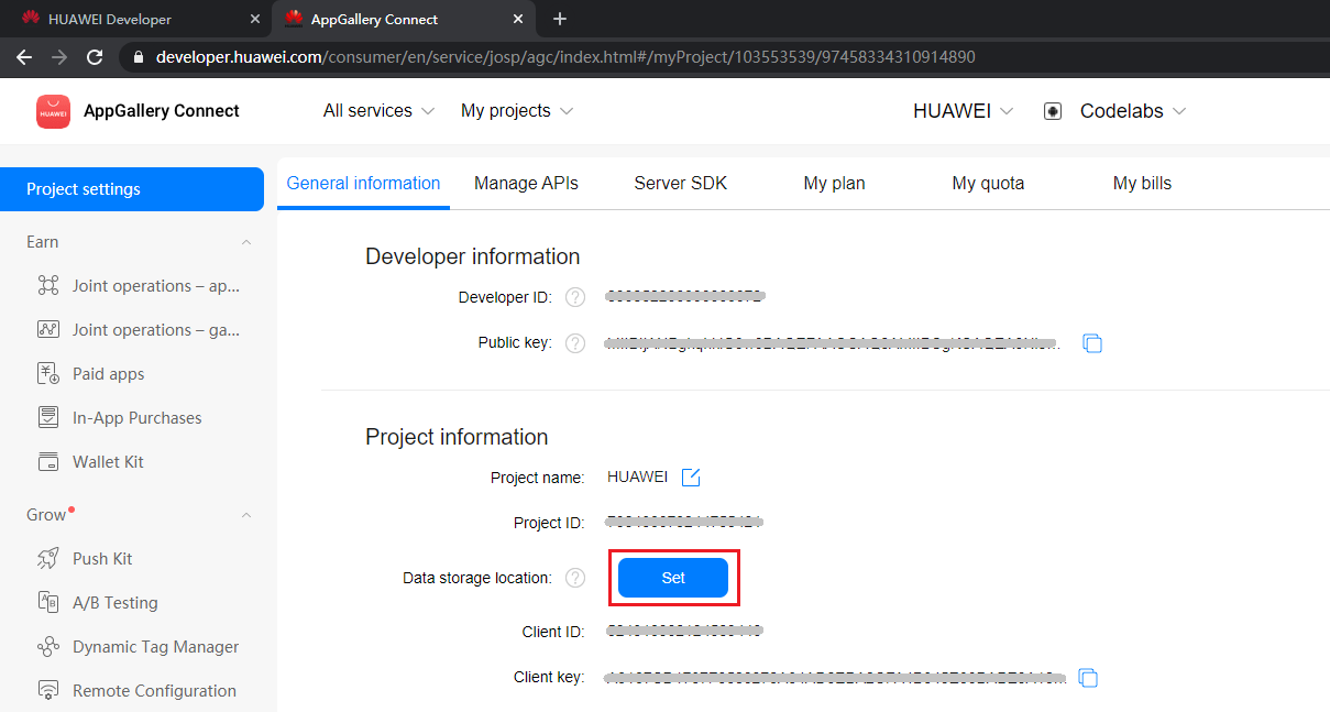 Sign in to AppGallery Connect and click My projects. Find your app project and click the app that needs to integrate the HMS Core SDK. Go to Project settings > General information. Then in the Project area, click Set.