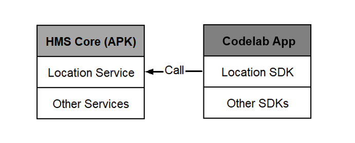 The following figure shows the basic architecture of the app. The codelab app will use the integrated Location SDK for HarmonyOS to call the location service in HMS Core (APK).