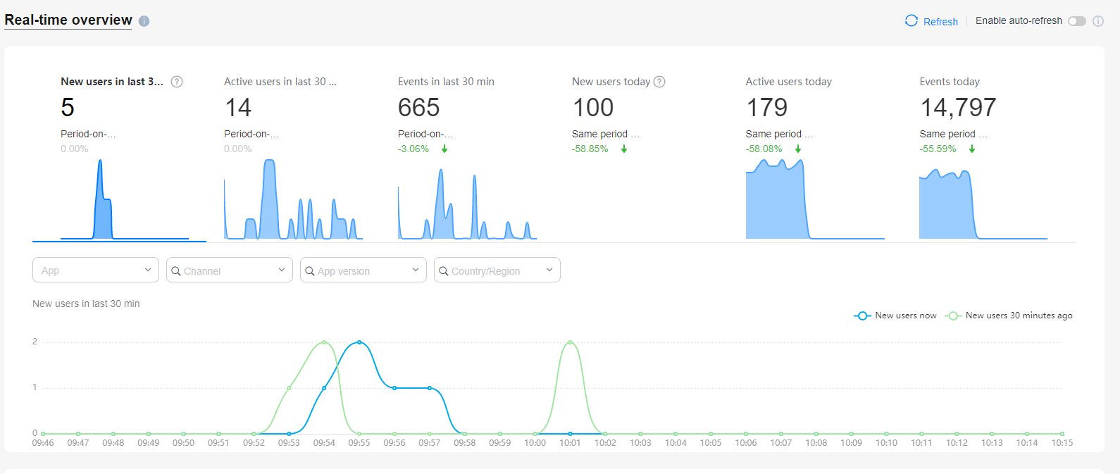 When app debugging is disabled, you can only view some analysis results on the Real-time overview page. Analysis results on other pages such as Event analysis and Launch analysis are available only after the corresponding data is processed on the next day.