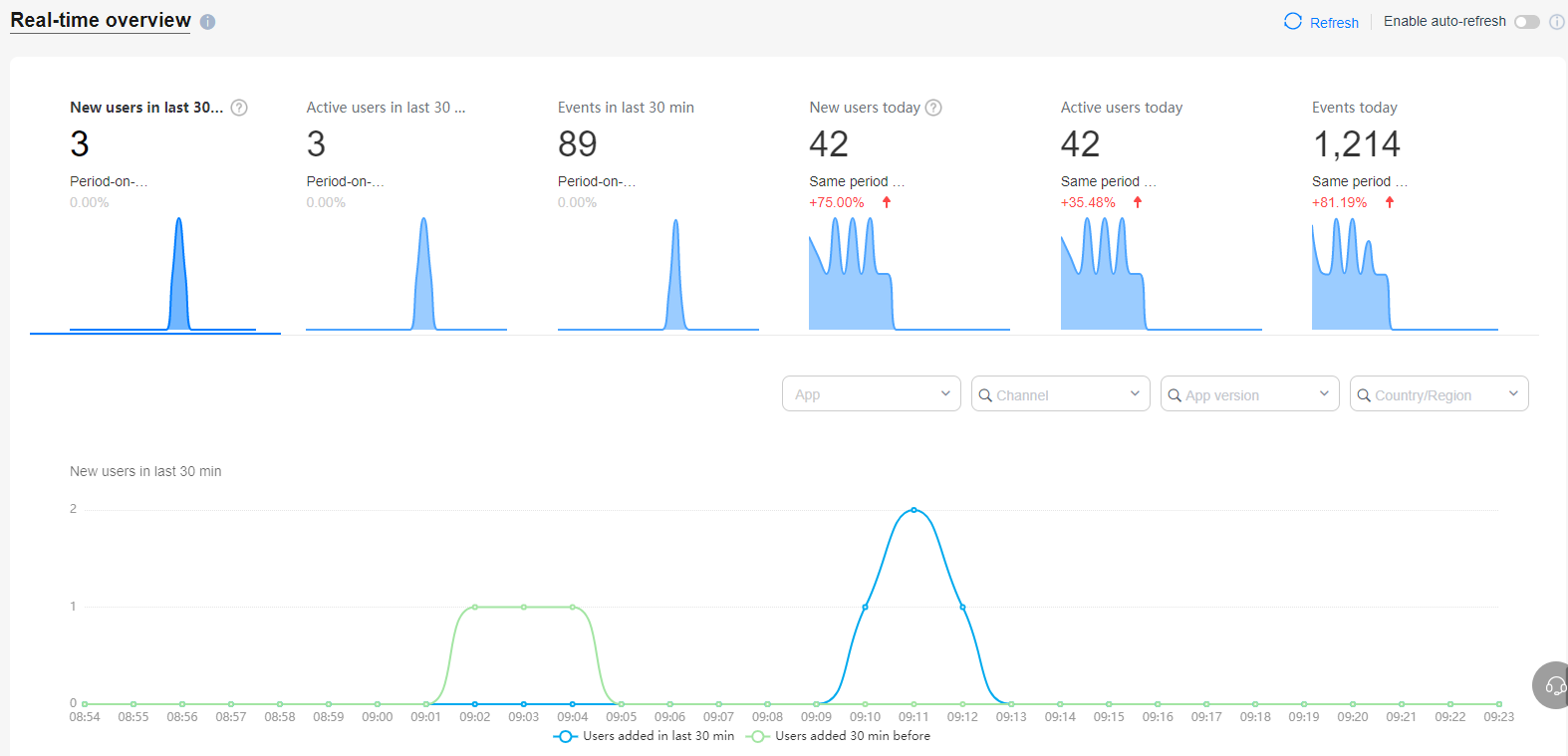 You can only view some analysis results on the Real-time overview page. Analysis results on other pages such as Event analysis and Launch analysis are available the day after the corresponding data is processed.