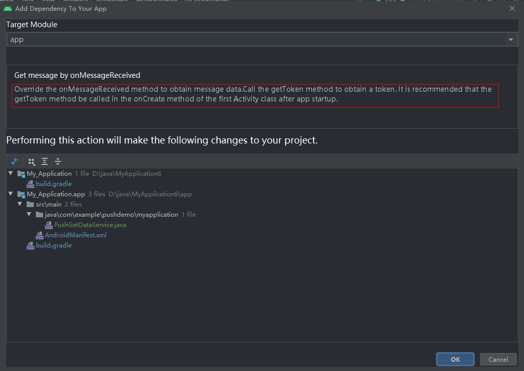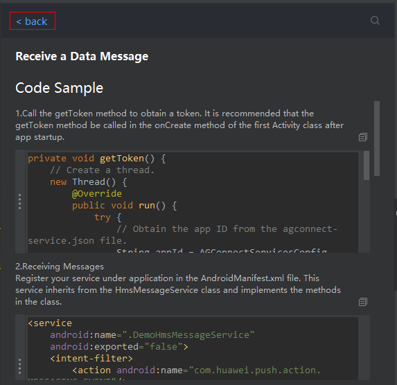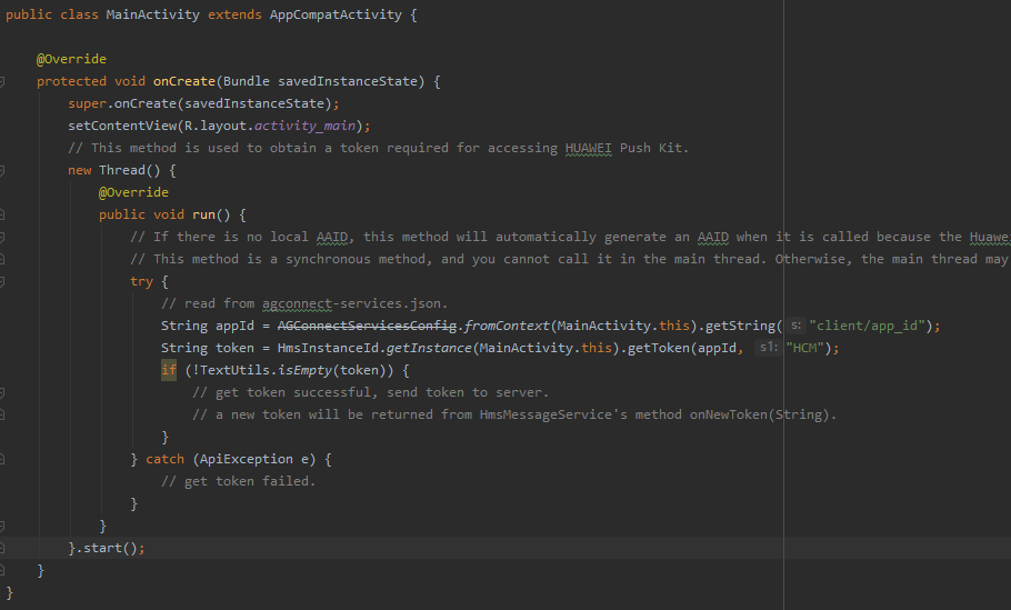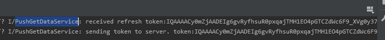 After running the demo project, ensure that the network of the device is connected. Then, a token can be automatically obtained and recorded in the logs. You can search for message push logs in the demo using the PushGetDataService character string.