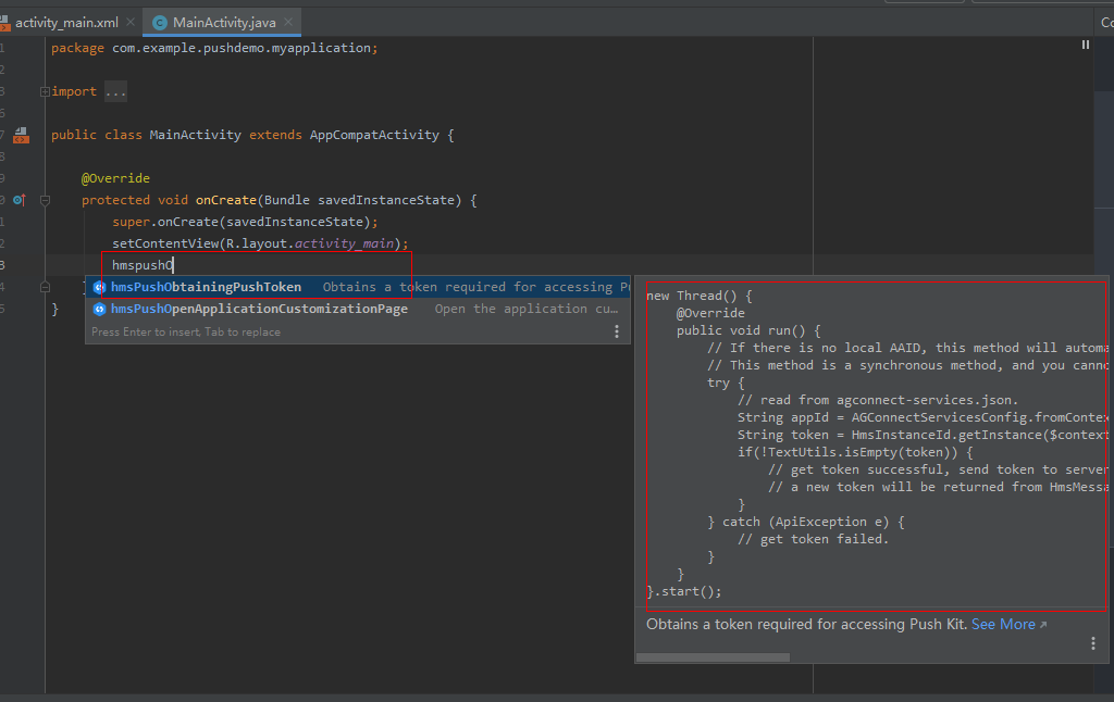 In the onCreate method of MainActivity, enter hmspush. The complete API code is displayed on the right, as shown in the following figure.