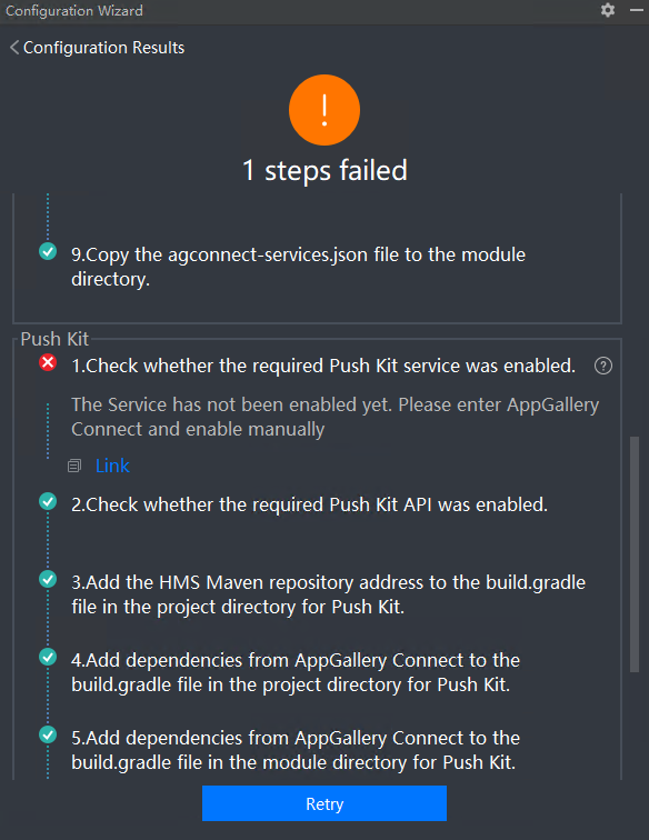 If an item fails to pass the check, click Link to manually modify the item as prompted. Then, click Retry to perform the check again.