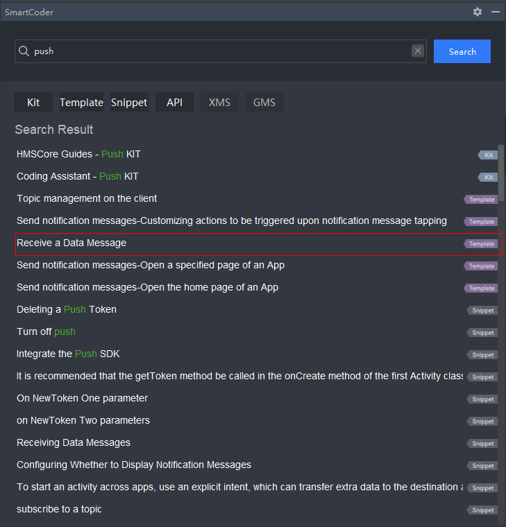 Enable SmartCoder, search for push, and select Receive a Data Message in the search result, as shown in the following figure.