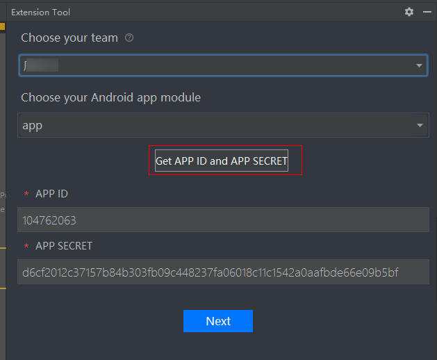 Click Get APP ID and APP SECRET. The tool automatically reads the app ID and app secret from AppGallery Connect.