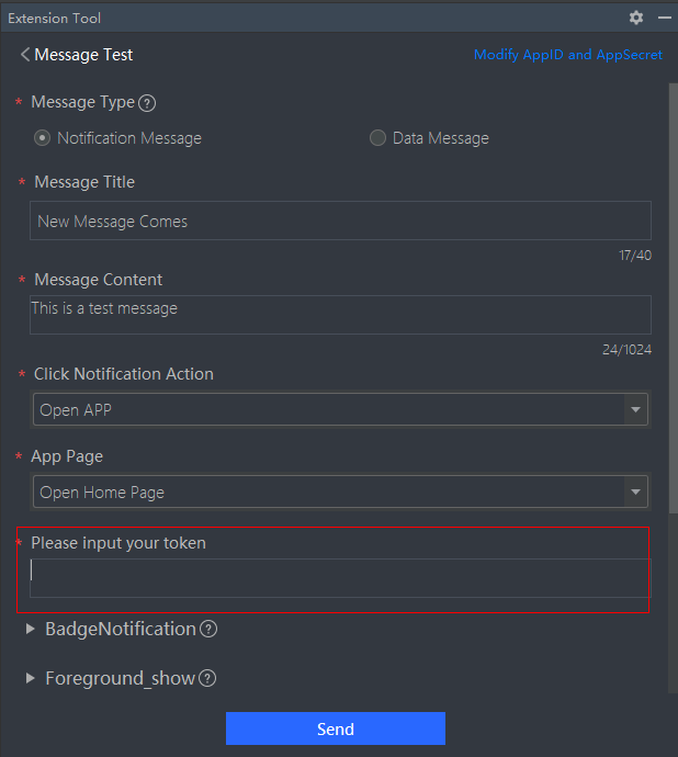 On the toolbar of the Push Kit card, select Message Test to test whether the server can push messages to the device.