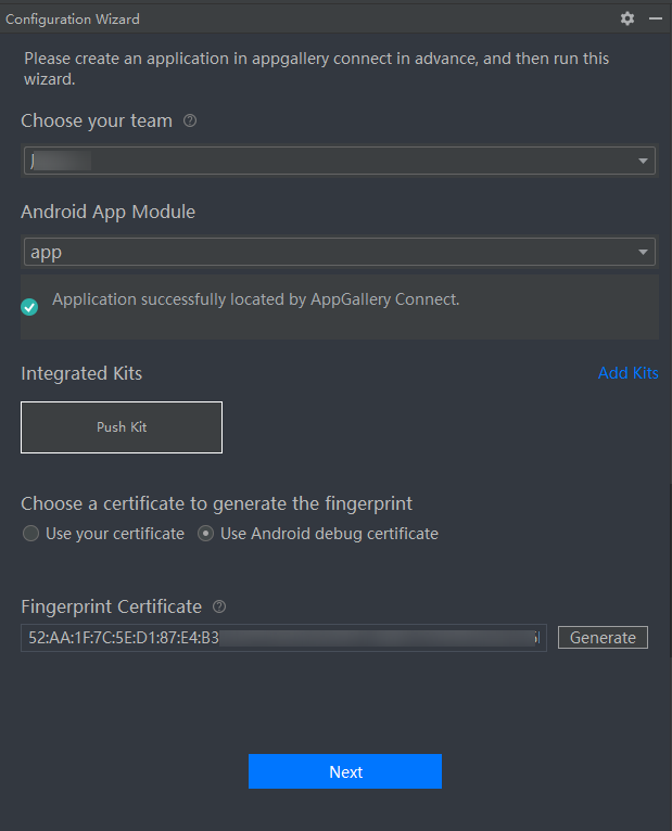 After sign-in authorization, select the team name, project module, kit (up to 5 kits), and certificate type, click Generate to generate an SHA-256 certificate fingerprint, and click Next.