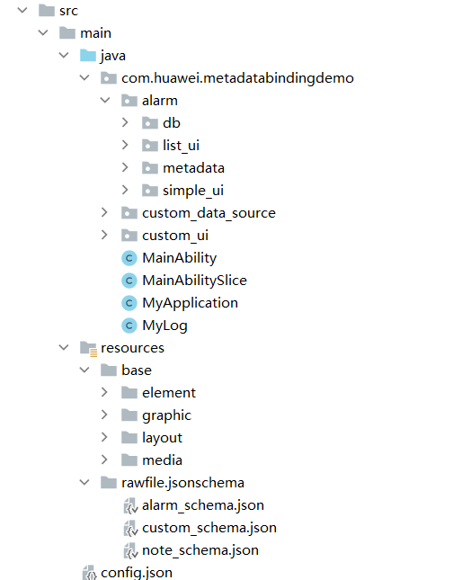 The metadata binding framework uses CustomDao.ICustomMetaDataHandler and SimpleDao.ISimpleMetaDataHandler to support custom data sources. Since ICustomMetaDataHandler can be used to fetch multiple pieces of metadata, we use it to implement a list container. The layout file has been elaborated in the previous sections and it is not described here. In this example, we use the database of the alarm clock list as the data source and add a new table to the database. For details, see the source code in the custom_data_source directory. The following shows only the implementation of CustomDao.ICustomMetaDataHandler.
