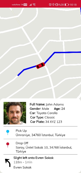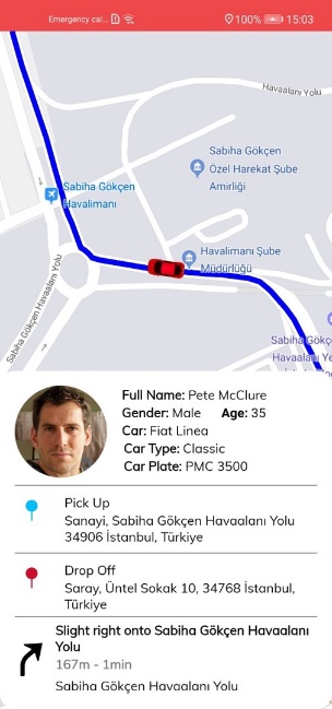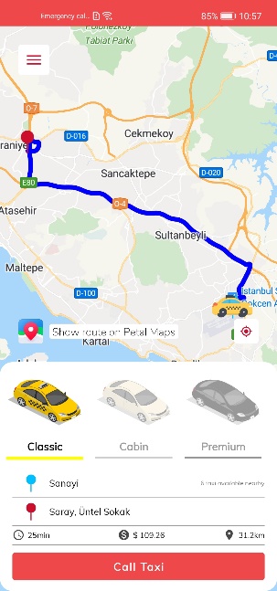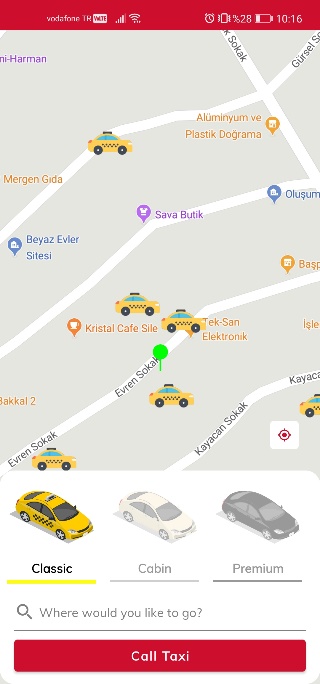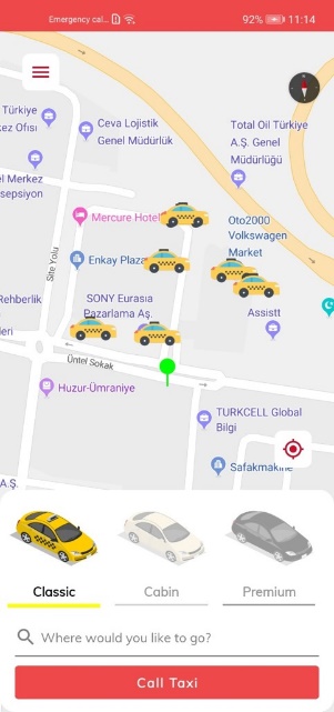 Map Kit is the most common service in lifestyle apps. In this application, a map kit was used to track taxis and routes. The user location can be displayed on the map, the desired destination can be selected on the map, icons can be added to the desired location (nearby taxis are shown.), the route and the movement on the route can be displayed on the map. These features were included in the application.